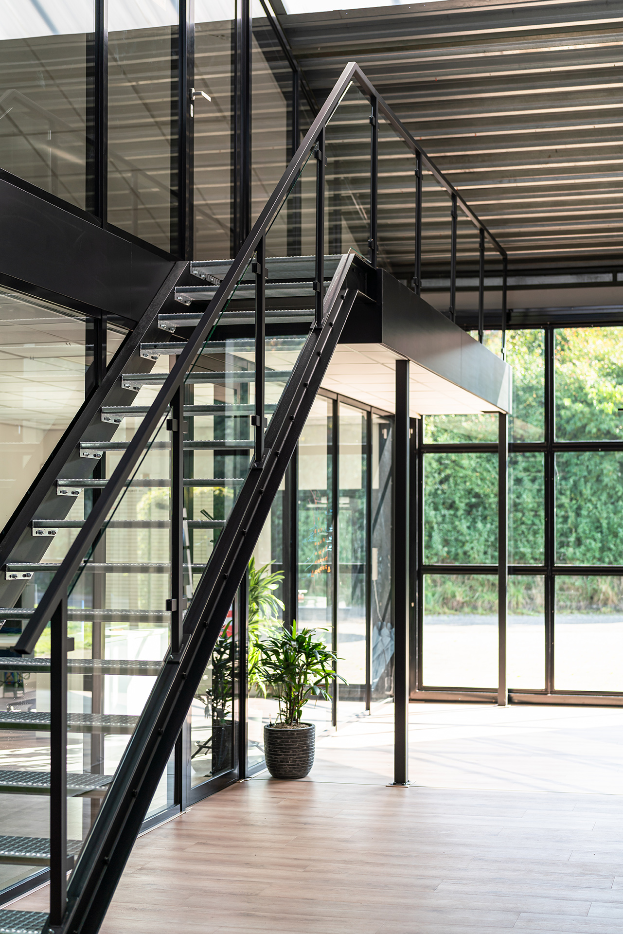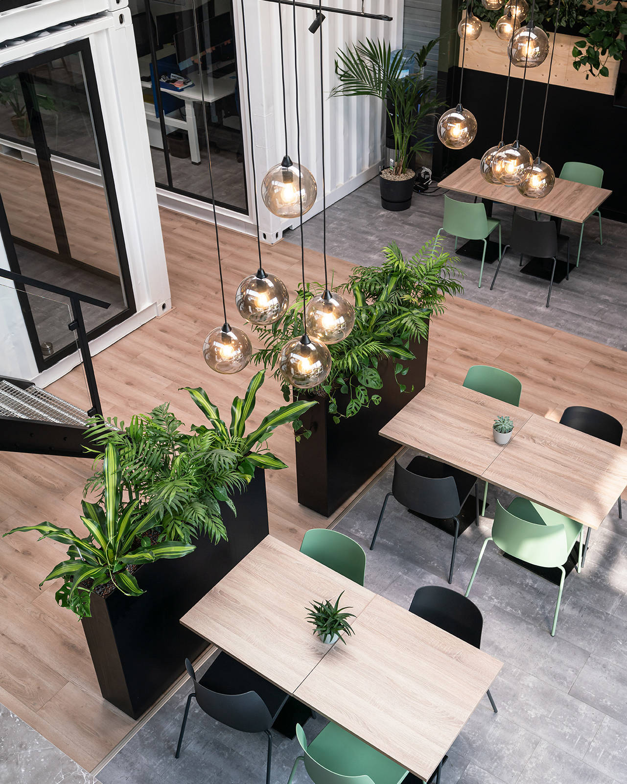 Een totaalontwerp van een kantoortuin voor een snel groeiend en technisch bedrijf in Utrecht. Door middel van een container-stack concept, is een lege loods getransformeerd naar een ruimtelijke werkplek voor afdeling van het bedrijf. Door de verschillende hoogtes van de gestapelde containers, wordt de hoogte van de loods geaccentueerd en optimaal benut. Ook ontstaan er verschillende werkruimtes én interessante loop- en kijklijnen om deze container-volumes heen. Door het accentueren van verschillende looproutes in de vloer en heldere zichtlijnen, krijgt de open ruimte dat gebruikt kan worden als lunch- of vergader locatie, samen met de grote glazen schuifdeuren achter in de loods een verrassingseffect.